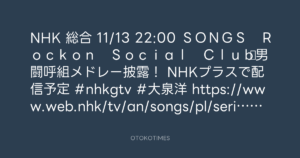 NHK 総合 11/13 22:00 SONGS Rockon Social Club▽男闘呼組メドレー披露! 📱NHKプラスで配信予定💻 #nhkgtv #大泉洋 https://www.web.nhk/tv/an/songs/pl/series-tep-7QRYY2G3VN