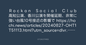 Rockon Social Club 高知公演、香川公演を開催延期、非常に強い台風10号接近の影響で https://hochi.news/articles/20240827-OHT1T51113.html?utm_source=dlvr.it&utm_medium=twitter