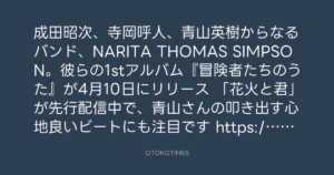 成田昭次、寺岡呼人、青山英樹からなるバンド、NARITA THOMAS SIMPSON。彼らの1stアルバム『冒険者たちのうた』が4月10日にリリース