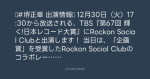 12月30日(火)17:30から放送される、TBS『第67回 輝く!日本レコード大賞』にRockon Social Clubと出演します!