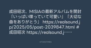 Real Sound(リアルサウンド) @realsoundjp – 15:37・2025年5月30日 2025 5/30 2025-05-30 東京レコード、Rockon Social Clubさんがリポスト成田昭次、MISIAの最新アルバムを開封 「いっぱい喋っていて可愛い」「大切な曲をありがとう」 https://realsound.jp/2025/05/post-2039847.html #成田昭次 https://realsound.jp/2025/05/post-2039847.html Source:https://x.com/realsoundjp/status/19283399380405... text X Post この記事が気に入ったら フォローしてね! Follow @OtokoTimes1988 よかったらシェアしてね! URLをコピーしました! 東京レコード @tokyo_records - 15:02・2025年5月30日 ニッポン放送「KURE オキーフ Presents 成田昭次のRockon The Knight」 @RockonTheKnight - 17:06・2025年5月30日
