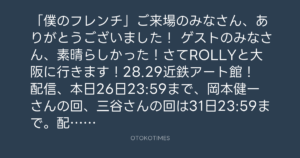 配信、本日26日23:59まで、岡本健一さんの回、三谷さんの回は31日23:59まで。配信4,500円