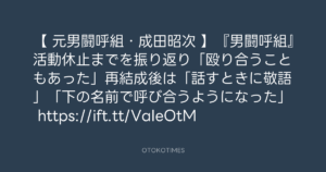 TBS NEWS DIG Powered by JNN @tbsnewsdig – 12:09・2026年1月24日 2026 1/24 2026-01-24 OTOKOTIMESさんがリポスト【 元男闘呼組・成田昭次 】『男闘呼組』活動休止までを振り返り「殴り合うこともあった」再結成後は「話すときに敬語」「下の名前で呼び合うようになった」 https://ift.tt/VaIeOtM Source:https://x.com/tbsnewsdig/status/201489830271037... text X Post この記事が気に入ったら フォローしてね! Follow @OtokoTimes1988 よかったらシェアしてね! URLをコピーしました! Rockon Social Club @rockonsocialclu - 12:05・2026年1月24日 【公式】TBS芸能&情報まとめ @TBS_geino - 12:15・2026年1月24日