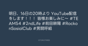 2nd Life あの人は今! @team54notice – 22:39・2026年3月15日 2026 3/15 2026-03-15 OTOKOTIMESさんがリポスト明日、16日の20時より YouTube配信をします!!! 皆様お楽しみに〜😁 #TEAM54 #2ndLife #前田耕陽 #RockonSosialClub #男闘呼組 Source:https://x.com/team54notice/status/2033176214547... text X Post この記事が気に入ったら フォローしてね! Follow @OtokoTimes1988 よかったらシェアしてね! URLをコピーしました! TOKYO FM 80.0 @tokyofm - 21:30・2026年3月15日 KURE 5-56 Presents Go! Go! Rockon! @GoGoRockon_556 - 22:58・2026年3月15日