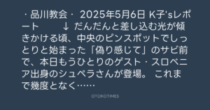 だんだんと差し込む光が傾きかける頃、中央のピンスポットでしっとりと始まった「偽り感じて」のサビ前で、本日もうひとりのゲスト・スロベニア出身のシュペラさんが登場。