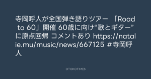 音楽ナタリー @natalie_mu – 12:00・2026年4月6日 2026 4/06 寺岡呼人 2026-04-06 寺岡呼人さんがリポスト寺岡呼人が全国弾き語りツアー 「Road to 60」開催 60歳に向け“歌とギター”に原点回帰 🔽コメントあり https://natalie.mu/music/news/667125 #寺岡呼人 Source:https://x.com/natalie_mu/status/204098792656229... text X Post 寺岡呼人 寺岡呼人 この記事が気に入ったら フォローしてね! Follow @OtokoTimes1988 よかったらシェアしてね! URLをコピーしました! チケットぴあ @news_pia - 11:00・2026年4月6日 ポップシーン @popscene_jp - 12:01・2026年4月6日 関連記事 Artist 寺岡呼人 1968.02.07