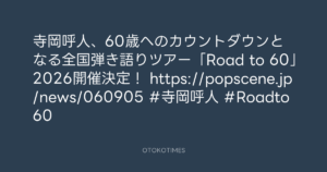 ポップシーン @popscene_jp – 12:01・2026年4月6日 2026 4/06 寺岡呼人 2026-04-06 寺岡呼人さんがリポスト寺岡呼人、60歳へのカウントダウンとなる全国弾き語りツアー「Road to 60」2026開催決定! https://popscene.jp/news/060905 #寺岡呼人 #Roadto60 Source:https://x.com/popscene_jp/status/20409881616572... text X Post 寺岡呼人 寺岡呼人 この記事が気に入ったら フォローしてね! Follow @OtokoTimes1988 よかったらシェアしてね! URLをコピーしました! 音楽ナタリー @natalie_mu - 12:00・2026年4月6日 LiveFans(ライブファンズ) @livefans - 13:15・2026年4月6日 関連記事 Artist 寺岡呼人 1968.02.07