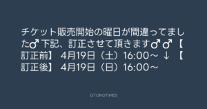 Hirokazu Ozaki @ozahirosan – 17:16・2026年4月12日 2026 4/12 2026-04-12 OTOKOTIMESさんがリポストチケット販売開始の曜日が間違ってました🙇♂️ 下記、訂正させて頂きます🙇♂️🙇♂️ 【訂正前】 4月19日(土)16:00〜 ↓ 【訂正後】 4月19日(日)16:00〜 Source:https://x.com/ozahirosan/status/204324177633787... text X Post この記事が気に入ったら フォローしてね! Follow @OtokoTimes1988 よかったらシェアしてね! URLをコピーしました! Koyo Maeda @koyomaeda - 15:39・2026年4月12日 TEAM54 @team54notice - 17:45・2026年4月12日