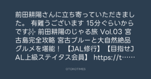 前田耕陽のじゃる旅 Vol.03 宮古島完全攻略 宮古ブルーと大自然絶品グルメを堪能! 【JAL修行】【目指せJAL上級ステイタス会員】 https://t.co/dwgLb8AnFg @YouTubeより