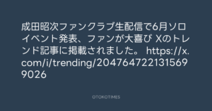 OTOKOTIMES @OtokoTimes1988 – 13:04・2026年4月25日 2026 4/25 2026-04-25 成田昭次ファンクラブ生配信で6月ソロイベント発表、ファンが大喜び Xのトレンド記事に掲載されました。 https://x.com/i/trending/2047647221315699026 Source:https://x.com/OtokoTimes1988/status/20478894772... text X Post この記事が気に入ったら フォローしてね! Follow @OtokoTimes1988 よかったらシェアしてね! URLをコピーしました! OTOKOTIMES @OtokoTimes1988 - 13:03・2026年4月25日 Steelpan Records_Nori Shiota @norishio88 - 14:21・2026年4月25日