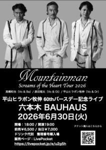 Mountainman 六本木公演「平山ヒラポン牧伸 60thバースデー記念ライブ」の一般チケット販売は、明日4月26日(日) 12:00スタート!