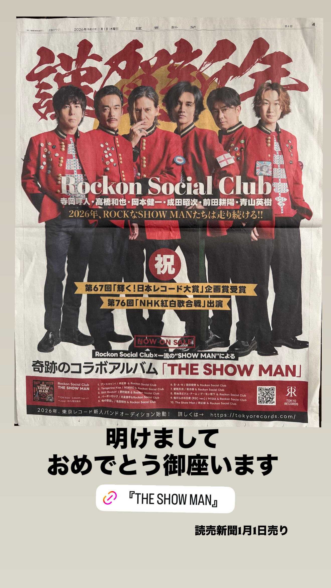 岡本健一 @kenichi.okamoto – 16:09・2026年1月1日(Instagram Stories) 2026 1/01 岡本健一 2026-01-01 明けまして おめでとう御座います 🔗『THE SHOW MAN』 読売新聞1月1日売り Source:https://www.instagram.com/stories/kenichi.okamo... Rockon Social Club 岡本健一 新年 岡本健一 この記事が気に入ったら フォローしてね! Follow @OtokoTimes1988 よかったらシェアしてね! URLをコピーしました! Rockon Social Club @rockonsocialclu - 午後0:00 · 2026年1月1日 青山英樹 @aoyama_hideki - 午後4:58 · 2026年1月1日 関連記事 Artist Rockon Social Club 2023.02.17 Artist 岡本健一 1969.05.21