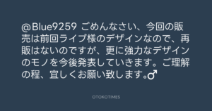 Addict of The Tripminds @Atripminds2021 – 13:33・2022年1月27日 2022 1/27 ADDICT OF THE TRIP MINDS 岡本健一 2022-01-27 @Blue9259 ごめんなさい、今回の販売は前回ライブ様のデザインなので、再販はないのですが、更に強力なデザインのモノを今後発表していきます。ご理解の程、宜しくお願い致します。🙇♂️ Source:https://x.com/Atripminds2021/status/14865579167... ADDICT OF THE TRIP MINDS text X Post 岡本健一 ADDICT OF THE TRIP MINDS 岡本健一 この記事が気に入ったら フォローしてね! Follow @OtokoTimes1988 よかったらシェアしてね! URLをコピーしました! Addict of The Tripminds @Atripminds2021 - 13:04・2022年1月27日 Addict of The Tripminds @Atripminds2021 - 13:34・2022年1月27日 関連記事 Artist ADDICT OF THE TRIP MINDS 1993.10.01 Artist 岡本健一 1969.05.21