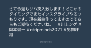 さて今週もリハ突入致します!どこかのタイミングでまたインスタライブやるつもりです。現在新曲作ってますのでそちらもご期待くださいね。 #川上シゲ #岡本健一 #atripminds2021 #男闘呼組