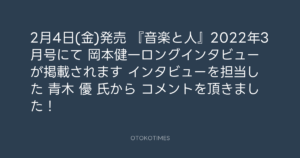 Addict of The Tripminds @Atripminds2021 – 10:45・2022年2月1日 2022 2/01 ADDICT OF THE TRIP MINDS 岡本健一 2022-02-01 2月4日(金)発売 『音楽と人』2022年3月号にて 岡本健一ロングインタビュー が掲載されます インタビューを担当した 青木 優 氏から コメントを頂きました! Source:https://x.com/Atripminds2021/status/14883276469... ADDICT OF THE TRIP MINDS text X Post 岡本健一 ADDICT OF THE TRIP MINDS 岡本健一 この記事が気に入ったら フォローしてね! Follow @OtokoTimes1988 よかったらシェアしてね! URLをコピーしました! Addict of the Trip Minds @atripminds2021 - 10:02・2022年2月1日(IG post) Addict of The Tripminds @Atripminds2021 - 10:46・2022年2月1日 関連記事 Artist ADDICT OF THE TRIP MINDS 1993.10.01 Artist 岡本健一 1969.05.21