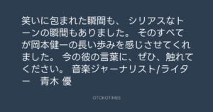 Addict of The Tripminds @Atripminds2021 – 10:49・2022年2月1日 2022 2/01 ADDICT OF THE TRIP MINDS 岡本健一 2022-02-01 笑いに包まれた瞬間も、 シリアスなトーンの瞬間もありました。 そのすべてが岡本健一の長い歩みを感じさせてくれました。 今の彼の言葉に、ぜひ、触れてください。 音楽ジャーナリスト/ライター 青木 優 Source:https://x.com/Atripminds2021/status/14883285093... ADDICT OF THE TRIP MINDS text X Post 岡本健一 ADDICT OF THE TRIP MINDS 岡本健一 この記事が気に入ったら フォローしてね! Follow @OtokoTimes1988 よかったらシェアしてね! URLをコピーしました! Addict of The Tripminds @Atripminds2021 - 10:48・2022年2月1日 Koyo Maeda @koyomaeda - 11:37・2022年2月1日 関連記事 Artist ADDICT OF THE TRIP MINDS 1993.10.01 Artist 岡本健一 1969.05.21