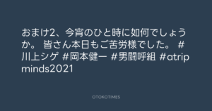 🎬 Addict of The Tripminds @Atripminds2021 – 19:59・2022年2月3日 2022 2/03 ADDICT OF THE TRIP MINDS 岡本健一 2022-02-03 おまけ2、今宵のひと時に如何でしょうか。 皆さん本日もご苦労様でした。 #川上シゲ #岡本健一 #男闘呼組 #atripminds2021 Source:https://x.com/Atripminds2021/status/14891917241... ADDICT OF THE TRIP MINDS text VIDEO X Post 岡本健一 ADDICT OF THE TRIP MINDS 岡本健一 この記事が気に入ったら フォローしてね! Follow @OtokoTimes1988 よかったらシェアしてね! URLをコピーしました! Kazuya Takahashi @hankykazy - 18:59・2022年2月3日(IG post) Addict of The Tripminds @Atripminds2021 - 20:07・2022年2月3日 関連記事 Artist ADDICT OF THE TRIP MINDS 1993.10.01 Artist 岡本健一 1969.05.21