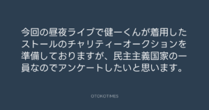 今回の昼夜ライブで健一くんが着用したストールのチャリティーオークションを準備しておりますが、民主主義国家の一員なのでアンケートしたいと思います。