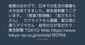 「授業7割理解」「友だちたくさん」 ウクライナから避難、都立高に通うアジマさん 自宅の父が気がかり:東京新聞 TOKYO Web https://www.tokyo-np.co.jp/article/182956