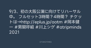 Addict of The Tripminds @Atripminds2021 – 19:05・2022年8月25日 2022 8/25 ADDICT OF THE TRIP MINDS 岡本健一 2022-08-25 9/3、初の大阪公演に向けてリハーサル中。 フルセット3時間?4時間? チケットは→http://eplus.jp/aotm #岡本健一 #男闘呼組 #川上シゲ #atripminds2021 Source:https://x.com/Atripminds2021/status/15627430272... ADDICT OF THE TRIP MINDS text X Post 岡本健一 ADDICT OF THE TRIP MINDS 岡本健一 この記事が気に入ったら フォローしてね! Follow @OtokoTimes1988 よかったらシェアしてね! URLをコピーしました! Koyo Maeda @koyomaeda - 16:03・2022年8月25日 🎬 Addict of The Tripminds @Atripminds2021 - 19:06・2022年8月25日 関連記事 Artist ADDICT OF THE TRIP MINDS 1993.10.01 Artist 岡本健一 1969.05.21