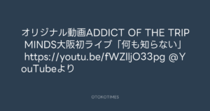Addict of The Tripminds @Atripminds2021 – 1:37・2022年9月8日 2022 9/08 ADDICT OF THE TRIP MINDS 岡本健一 2022-09-08 オリジナル動画📹ADDICT OF THE TRIP MINDS🌟大阪初ライブ🌟「何も知らない」 https://youtu.be/fWZlljO33pg @YouTubeより Source:https://x.com/Atripminds2021/status/15675525760... ADDICT OF THE TRIP MINDS text X Post 岡本健一 ADDICT OF THE TRIP MINDS 岡本健一 この記事が気に入ったら フォローしてね! Follow @OtokoTimes1988 よかったらシェアしてね! URLをコピーしました! 寺岡呼人 @yohito_teraoka - 23:29・2022年9月7日 Addict of the Trip Minds @atripminds2021 - 16:57・2022年9月8日(IG post) 関連記事 Artist ADDICT OF THE TRIP MINDS 1993.10.01 Artist 岡本健一 1969.05.21