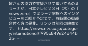 皆さんの協力で支援させて頂いてるのミラーナが、日本テレビ23日(木)の「news zero」でミラーナ家族へのインタビューをご紹介予定です。お時間の御都合付く方は是非。リンクは前回の映像です。