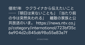 侵攻1年 ウクライナから伝えたいこと……「明日は来ないことも」「当たり前の今は突然失われる」 離散の家族と公共放送のいま。 https://news.ntv.co.jp/category/international/723bf35c6e904d2c845d698a55e83e7f