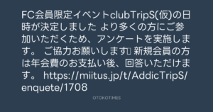 Addict of The Tripminds @Atripminds2021 – 17:04・2023年12月27日 2023 12/27 ADDICT OF THE TRIP MINDS 岡本健一 2023-12-27 FC会員限定イベントclubTripS(仮)の日時が決定しました より多くの方にご参加いただくため、アンケートを実施します。 ご協力お願いします☆ 新規会員の方は年会費のお支払い後、回答いただけます。 https://miitus.jp/t/AddicTripS/enquete/1708 Source:https://x.com/Atripminds2021/status/17399202710... ADDICT OF THE TRIP MINDS text X Post 岡本健一 ADDICT OF THE TRIP MINDS 岡本健一 この記事が気に入ったら フォローしてね! Follow @OtokoTimes1988 よかったらシェアしてね! URLをコピーしました! Addict of the Trip Minds @atripminds2021 - 23:09・2023年12月26日(IG post) 東京レコード @tokyo_records - 18:00・2023年12月27日 関連記事 Artist ADDICT OF THE TRIP MINDS 1993.10.01 Artist 岡本健一 1969.05.21