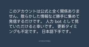 OTOKOTIMES @OtokoTimes1988 – 13:13・2023年9月2日 2023 9/02 2023-09-02 このアカウントは公式と全く関係ありません、散らかした情報など勝手に集めて発信するだけです。 人力 bot として見ていただけると幸いです。 更新タイミングも不定です。 日本語下手です。 Source:https://x.com/OtokoTimes1988/status/16978249511... text X Post この記事が気に入ったら フォローしてね! Follow @OtokoTimes1988 よかったらシェアしてね! URLをコピーしました! OTOKOTIMES @OtokoTimes1988 - 12:27・2023年9月2日 OTOKOTIMES @OtokoTimes1988 - 14:51・2023年9月2日