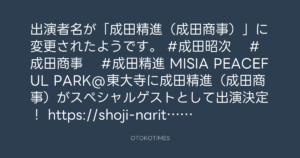 OTOKOTIMES @OtokoTimes1988 – 18:18・2023年9月15日 2023 9/15 2023-09-15 出演者名が「成田精進(成田商事)」に変更されたようです。 #成田昭次 #成田商事 #成田精進 MISIA PEACEFUL PARK@東大寺に成田精進(成田商事)がスペシャルゲストとして出演決定! https://shoji-narita.jp/live/2023/1810/ Source:https://x.com/OtokoTimes1988/status/17026129552... text X Post この記事が気に入ったら フォローしてね! Follow @OtokoTimes1988 よかったらシェアしてね! URLをコピーしました! Rockon Social Club @rockonsocialclub - 17:02・2023年9月15日(IG Stories) 寺岡 呼人 @yohitoteraoka - 19:04・2023年9月15日(IG post)