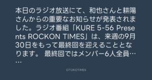 本日のラジオ放送にて、和也さんと耕陽さんからの重要なお知らせが発表されました。ラジオ番組「KURE 5-56 Presents ROCKON TIMES」は、来週の9月30日をもって最終回を迎えることとなります。