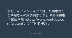 OTOKOTIMES @OtokoTimes1988 – 20:54・2023年11月13日 2023 11/13 2023-11-13 なお、インスタライブで話した和也さんと耕陽さんの朗読劇はこちら #高橋和也 #前田耕陽 https://www.youtube.com/watch?v=JfrTKN1H09s Source:https://x.com/OtokoTimes1988/status/17240329267... text X Post この記事が気に入ったら フォローしてね! Follow @OtokoTimes1988 よかったらシェアしてね! URLをコピーしました! OTOKOTIMES @OtokoTimes1988 - 20:45・2023年11月13日 🎬 Kazuya Takahashi @hankykazy - 21:52・2023年11月13日(IG post)