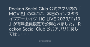 Rockon Social Club 公式アプリ内の「MOVIE」の中にに、本日のインスタライブアーカイヴ「IG LIVE 2023/11/13」が有料会員限定で公開されました。
