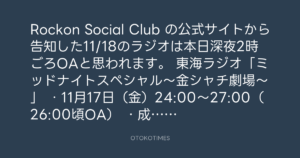 Rockon Social Club の公式サイトから告知した11/18のラジオは本日深夜2時ごろOAと思われます。