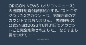 ORICON NEWS(オリコンニュース)の男闘呼組寄付記事紹介するポストにタグつけたXアカウントは、男闘呼組のアカウントではありません。