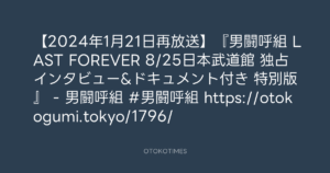 OTOKOTIMES @OtokoTimes1988 – 10:20・2024年1月17日 2024 1/17 2024-01-17 【2024年1月21日再放送】『男闘呼組 LAST FOREVER 8/25日本武道館 独占インタビュー&ドキュメント付き 特別版』 – 男闘呼組 #男闘呼組 https://otokogumi.tokyo/1796/ Source:https://x.com/OtokoTimes1988/status/17474286458... text X Post この記事が気に入ったら フォローしてね! Follow @OtokoTimes1988 よかったらシェアしてね! URLをコピーしました! 青山英樹 @aoyama_hideki - 23:02・2024年1月16日 OTOKOTIMES @OtokoTimes1988 - 11:17・2024年1月17日