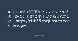 OTOKOTIMES @OtokoTimes1988 – 11:29・2024年3月14日 2024 3/14 2024-03-14 #CLUB55 成田昭次公式ファンフラグの「SHOJI’S STORY」が更新されました。 https://club55.shoji-narita.com/message/ Source:https://x.com/OtokoTimes1988/status/17681019958... text X Post この記事が気に入ったら フォローしてね! Follow @OtokoTimes1988 よかったらシェアしてね! URLをコピーしました! 東京レコード @tokyo_records - 11:00・2024年3月14日 東京レコード @tokyo_records - 12:00・2024年3月14日