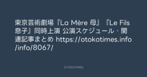 OTOKOTIMES @OtokoTimes1988 – 1:46・2024年4月14日 2024 4/14 2024-04-14 東京芸術劇場『La Mère 母』『Le Fils 息子』同時上演 公演スケジュール・関連記事まとめ https://otokotimes.info/info/8067/ Source:https://x.com/OtokoTimes1988/status/17791893769... text X Post この記事が気に入ったら フォローしてね! Follow @OtokoTimes1988 よかったらシェアしてね! URLをコピーしました! 岡本健一 @kenichi.okamoto - 01:38・2024年4月14日(IG post) OTOKOTIMES @OtokoTimes1988 - 10:28・2024年4月14日