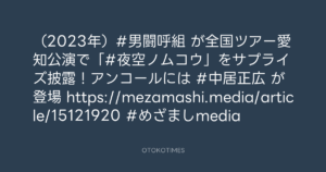 (2023年)#男闘呼組 が全国ツアー愛知公演で「#夜空ノムコウ」をサプライズ披露!アンコールには #中居正広 が登場 https://mezamashi.media/article/15121920 #めざましmedia