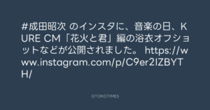 OTOKOTIMES @OtokoTimes1988 – 19:44・2024年7月16日 2024 7/16 2024-07-16 #成田昭次 のインスタに、音楽の日、KURE CM「花火と君」編の浴衣オフショットなどが公開されました。 https://www.instagram.com/p/C9er2IZBYTH/ Source:https://x.com/OtokoTimes1988/status/18131628410... text X Post この記事が気に入ったら フォローしてね! Follow @OtokoTimes1988 よかったらシェアしてね! URLをコピーしました! OTOKOTIMES @OtokoTimes1988 - 19:43・2024年7月16日 OTOKOTIMES @OtokoTimes1988 - 19:45・2024年7月16日