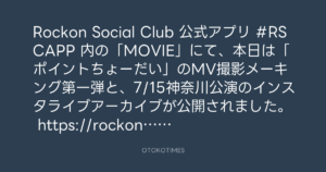 OTOKOTIMES @OtokoTimes1988 – 19:48・2024年7月16日 2024 7/16 2024-07-16 Rockon Social Club 公式アプリ #RSCAPP 内の「MOVIE」にて、本日は「ポイントちょーだい」のMV撮影メーキング第一弾と、7/15神奈川公演のインスタライブアーカイブが公開されました。 https://rockonsocialclub.com/app/ Source:https://x.com/OtokoTimes1988/status/18131637395... text X Post この記事が気に入ったら フォローしてね! Follow @OtokoTimes1988 よかったらシェアしてね! URLをコピーしました! OTOKOTIMES @OtokoTimes1988 - 19:45・2024年7月16日 OTOKOTIMES @OtokoTimes1988 - 19:50・2024年7月16日