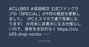 OTOKOTIMES @OtokoTimes1988 – 12:43・2024年8月31日 2024 8/31 2024-08-31 #CLUB55 #成田昭次 公式ファンクラブの「SPECIAL」が9月の壁紙を更新しました。(PCとスマホで違う写真になります) ※月末に非表示になる仕様らしいので、保存をお忘れなく https://club55.shoji-narita.com/special/ Source:https://x.com/OtokoTimes1988/status/18297266526... text X Post この記事が気に入ったら フォローしてね! Follow @OtokoTimes1988 よかったらシェアしてね! URLをコピーしました! Koyo Maeda @koyomaeda - 10:54・2024年8月31日 OTOKOTIMES @OtokoTimes1988 - 14:35・2024年8月31日