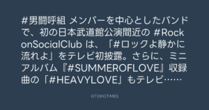 #男闘呼組 メンバーを中心としたバンドで、初の日本武道館公演間近の #RockonSocialClub は、「#ロックよ静かに流れよ」をテレビ初披露。さらに、ミニアルバム『#SUMMEROFLOVE』収録曲の「#HEAVYLOVE」もテレビ初披露する。