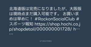 OTOKOTIMES @OtokoTimes1988 – 1:33・2024年9月9日 2024 9/09 2024-09-09 北海道版は完売になりましたが、大阪版は現時点まだ購入可能です。 お買い求めは早めに! #RockonSocialClub #スポーツ報知 https://shop.hochi.co.jp/shopdetail/000000001728/ https://x.com/hochi_oskhensei/status/1832755157224063393 Source:https://x.com/OtokoTimes1988/status/18328195400... text X Post この記事が気に入ったら フォローしてね! Follow @OtokoTimes1988 よかったらシェアしてね! URLをコピーしました! OTOKOTIMES @OtokoTimes1988 - 15:12・2024年9月8日 🎬 Rockon Social Club @rockonsocialclub - 10:07・2024年9月9日(IG Stories)
