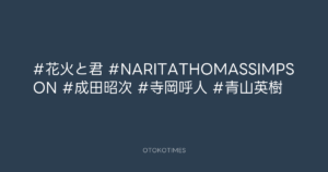 OTOKOTIMES @OtokoTimes1988 – 22:56・2024年9月20日 2024 9/20 2024-09-20 #花火と君 #NARITATHOMASSIMPSON #成田昭次 #寺岡呼人 #青山英樹 Source:https://x.com/OtokoTimes1988/status/18371287857... text X Post この記事が気に入ったら フォローしてね! Follow @OtokoTimes1988 よかったらシェアしてね! URLをコピーしました! OTOKOTIMES @OtokoTimes1988 - 22:55・2024年9月20日 質問BOX – 2024年9月21日(CLUB 55)