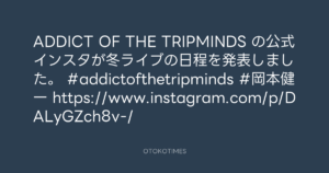 OTOKOTIMES @OtokoTimes1988 – 0:53・2024年9月22日 2024 9/22 2024-09-22 ADDICT OF THE TRIPMINDS の公式インスタが冬ライブの日程を発表しました。 #addictofthetripminds #岡本健一 https://www.instagram.com/p/DALyGZch8v-/ Source:https://x.com/OtokoTimes1988/status/18375204935... text X Post この記事が気に入ったら フォローしてね! Follow @OtokoTimes1988 よかったらシェアしてね! URLをコピーしました! Addict of the Trip Minds @atripminds2021 - 00:24・2024年9月22日(IG post) OTOKOTIMES @OtokoTimes1988 - 1:01・2024年9月22日
