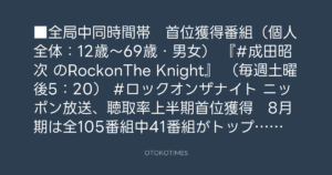 ニッポン放送、聴取率上半期首位獲得 8月期は全105番組中41番組がトップ【番組一覧】 | ORICON NEWS https://www.oricon.co.jp/news/2346612/full/?utm_source=Twitter&utm_medium=social&ref_cd=twshare @oriconより