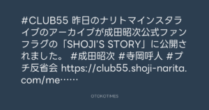 OTOKOTIMES @OtokoTimes1988 – 21:29・2024年10月25日 2024 10/25 2024-10-25 #CLUB55 昨日のナリトマインスタライブのアーカイブが成田昭次公式ファンフラグの「SHOJI’S STORY」に公開されました。 #成田昭次 #寺岡呼人 #プチ反省会 https://club55.shoji-narita.com/message/ Source:https://x.com/OtokoTimes1988/status/18497903398... text X Post この記事が気に入ったら フォローしてね! Follow @OtokoTimes1988 よかったらシェアしてね! URLをコピーしました! 青山英樹 @aoyama_hideki - 21:06・2024年10月25日 OTOKOTIMES @OtokoTimes1988 - 23:31・2024年10月25日