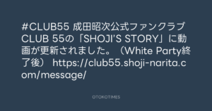 OTOKOTIMES @OtokoTimes1988 – 23:31・2024年10月25日 2024 10/25 2024-10-25 #CLUB55 成田昭次公式ファンクラブCLUB 55の「SHOJI’S STORY」に動画が更新されました。(White Party終了後) https://club55.shoji-narita.com/message/ Source:https://x.com/OtokoTimes1988/status/18498210582... text X Post この記事が気に入ったら フォローしてね! Follow @OtokoTimes1988 よかったらシェアしてね! URLをコピーしました! OTOKOTIMES @OtokoTimes1988 - 21:29・2024年10月25日 🎬 動画 @SHOJI'S STORY・2024年10月26日(CLUB 55)