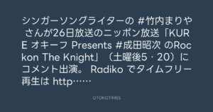 シンガーソングライターの #竹内まりや さんが26日放送のニッポン放送「KURE オキーフ Presents #成田昭次 のRockon The Knight」(土曜後5・20)にコメント出演。